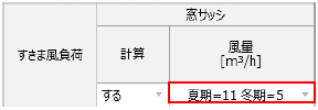 | 夏期 面積当りの風量 [m³/(m²・h)] | 窓サッシ面積当たりの風量です。 「サッシ種類」、「気密性」、「すきま風の風向と風速」の「夏期 風速」で確定します。 確定した後、「面積当りの風量」を変更した場合、「サッシ種類」は”(直接入力)”となります。 0~99.999の範囲が入力可能です。 |