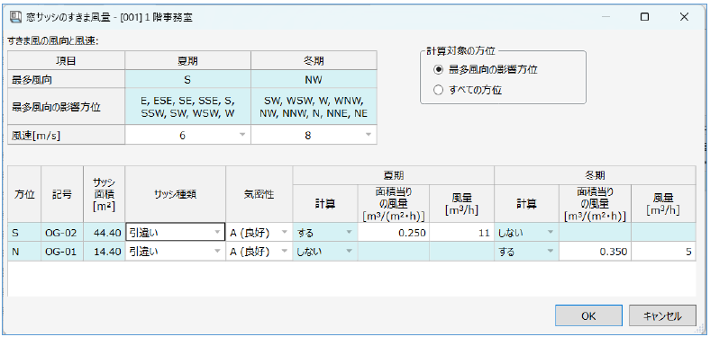 | すべての方位 | 「窓サッシのすきま風量」表の計算条件をユーザーが自由に設定できます。 |