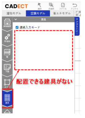 カテゴリメニュー「建具」では、「室/部材」で作成した建具アイテムを壁に配置することができます。そのため配置できる建具がない場合は、まずカテゴリメニュー「室/部材」-「建具」から建具をご登録ください。こちらで登録した建具がカテゴリメニュー「建具」に表示され、作図の壁上に配置することができるようになります。