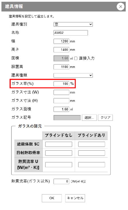 ガラス率は直接入力または「ガラス寸法(W)/(H)」を入力することで自動算出が可能です。