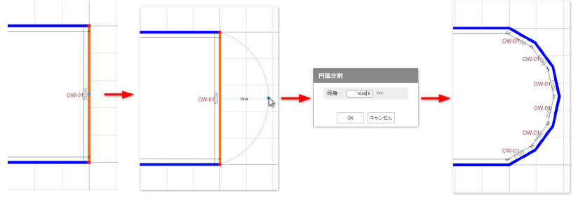 壁中央に青色の頂点が表示されるため、頂点を円弧の描きたい方向へマウスで引っ張ります。マウスを離すと「円弧分割」ダイアログが表示されるので、壁からの距離を入力し「OK」を押下すると、一辺の長さが等しい円弧が作成されます。