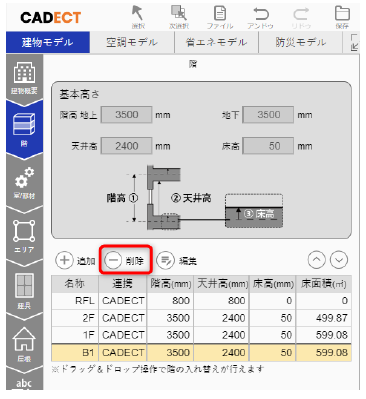 削除したい階を選択し、「-削除」ボタンを押下します。