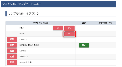 2.ソフトウェア ランチャーメニューのRebro横の「DL」ボタンを押下